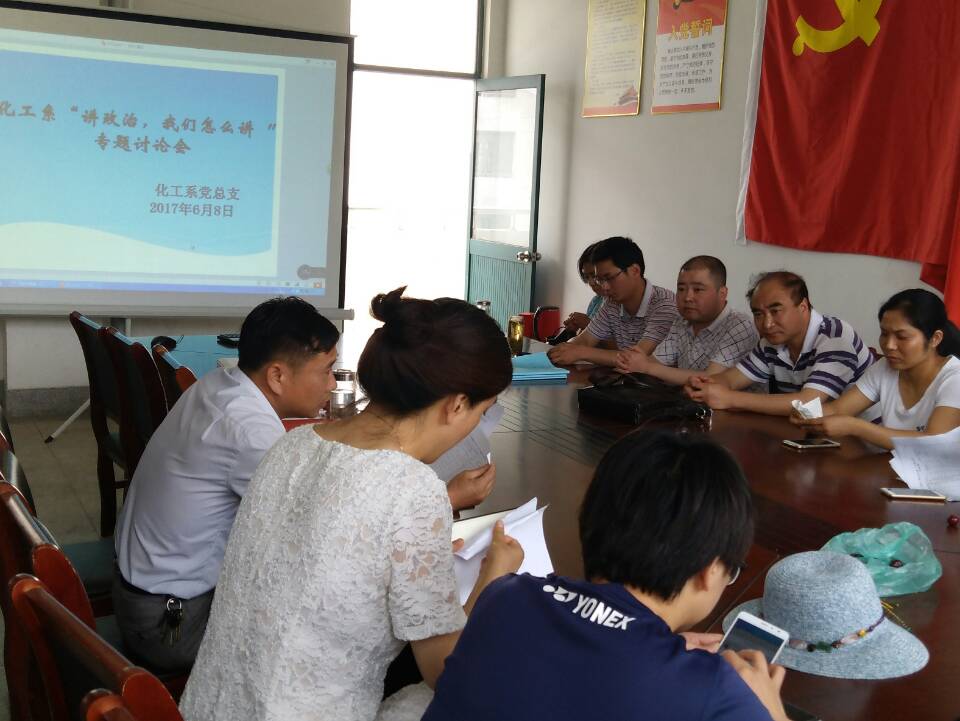 按照学校“两学一做”学习教育常态化制度化和“讲政治、重规矩、作表率”专题教育的统一部署,6月8日,化工系党总支在系会议室召开“讲政治,我们怎么讲”专题讨论会,会议由系总支书记主持,全体党员参加会议。