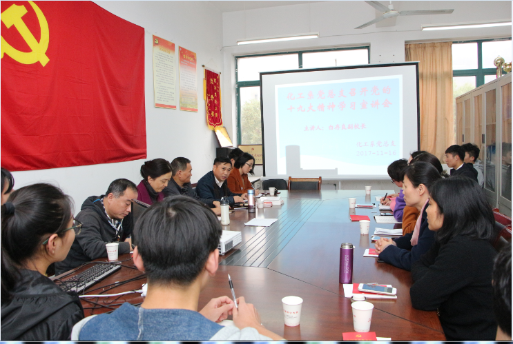 会上,陈武同志传达了校党委关于扎实推进党的十九大精神学习宣传贯彻工作的实施意见。并对化工系学习宣传贯彻工作作了具体安排,要求大家在学懂弄通做实上下功夫,充分认识学习宣传贯彻十九大精神的重大政治意义、现实意义和历史意义。深刻领会十九大提出的一系列新思想、新论断、新要求。