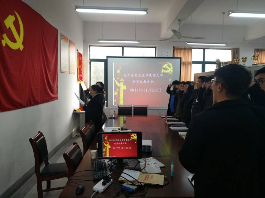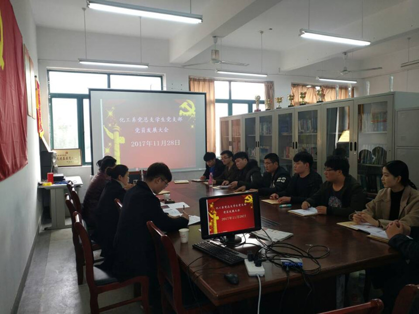 2017年11月28日下午,化工系学生党支部在系会议室召开支部大会,大会议程讨论关于周子杰等10位同学发展为中共预备党员的事宜。出席会议的有校组织人事部组织科科长、化工系学生党支部书记、辅导员、班主任、党员教师及学生党支部全体党员和入党积极分子,会议由学生党支部书记主持。