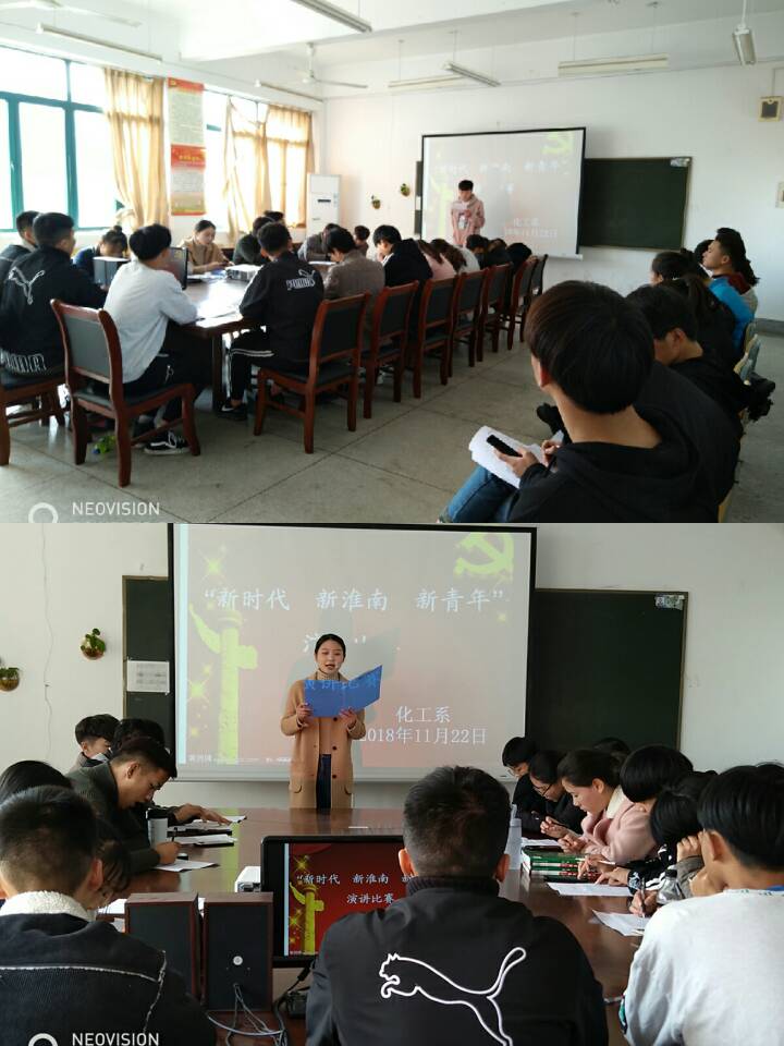 为全面深入学习宣传贯彻习近平新时代中国特色社会主义思想和党的十九大精神,喜迎改革开放四十周年,在高校中大力开展“四进四信”活动,加强对青年学生的思想引领,11月22日下午,化工系团总支于系会议室举办了“新时代•新淮南•新青年”演讲比赛。